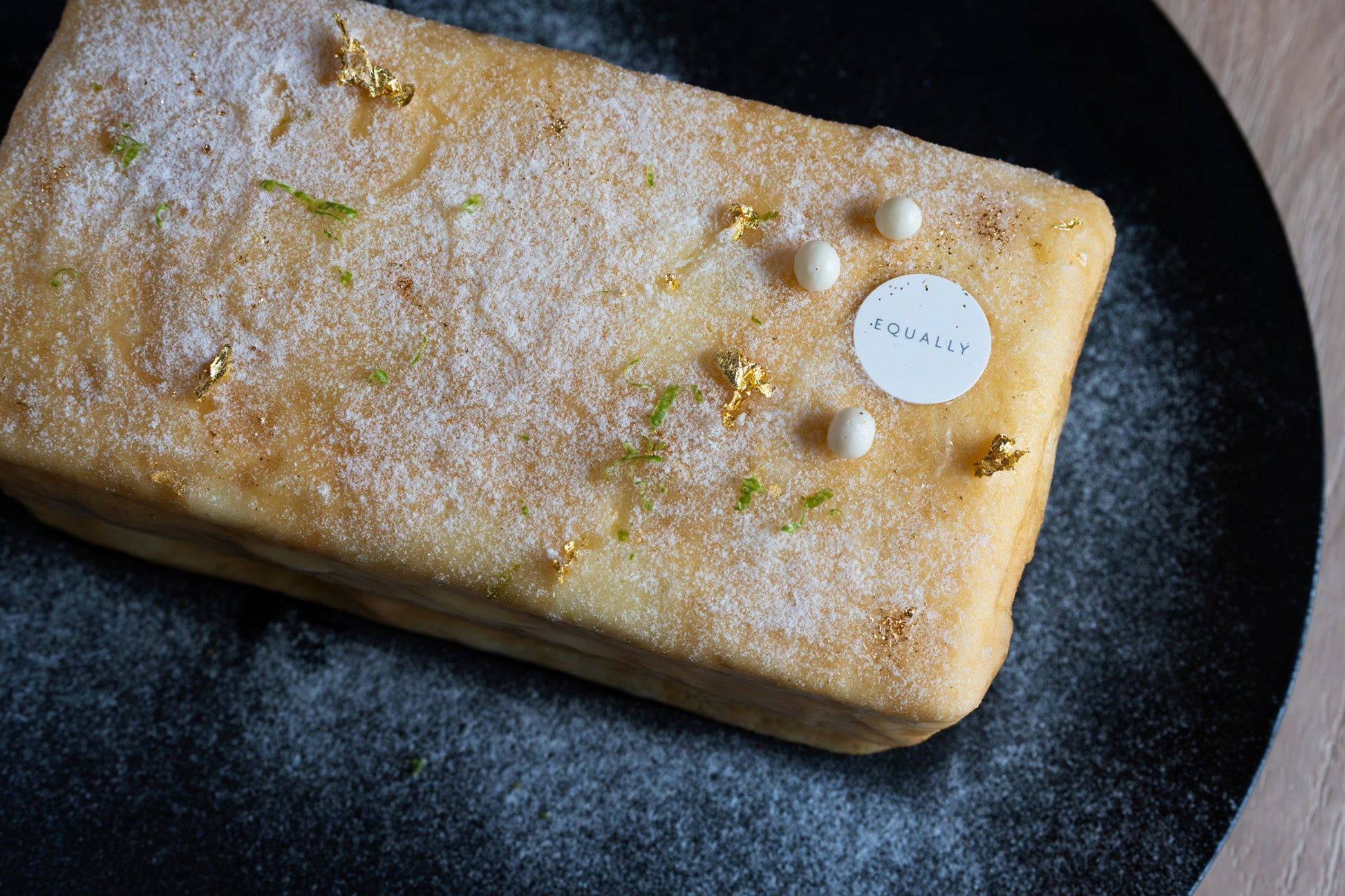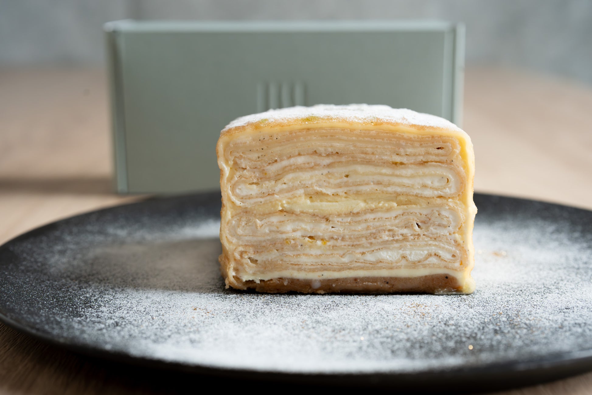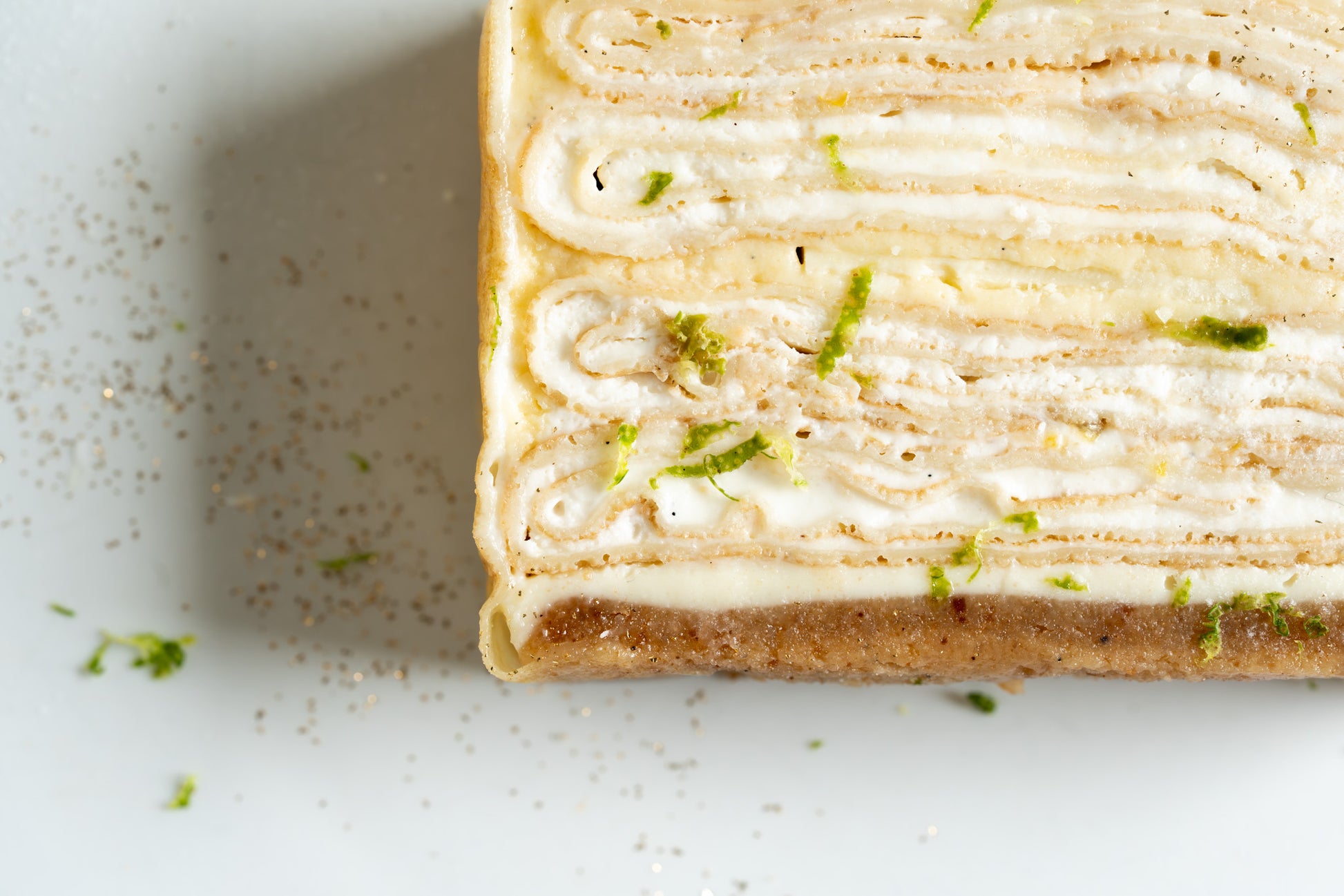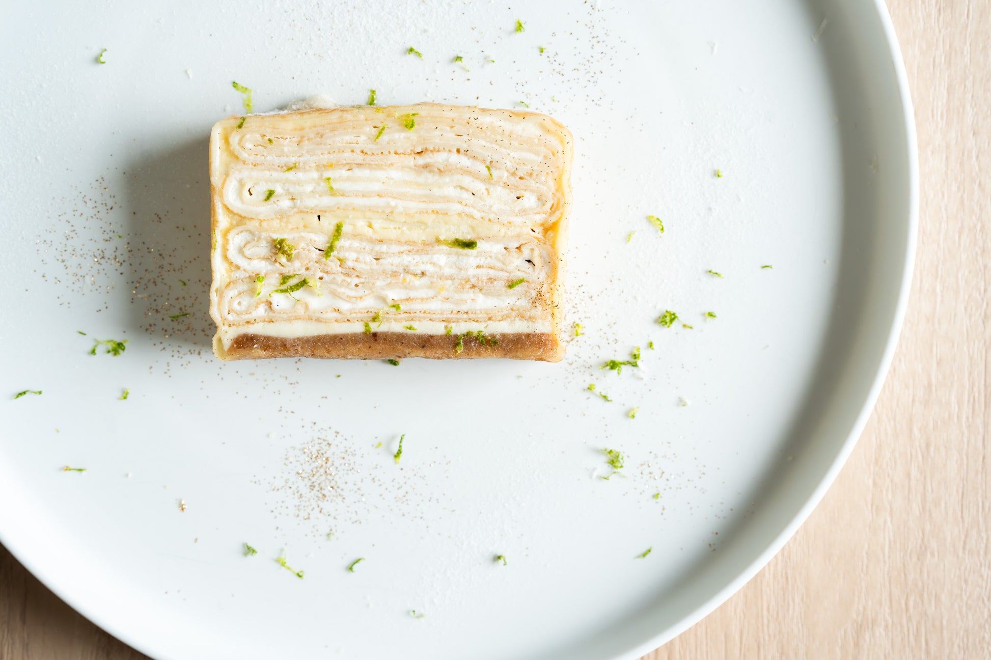 Crepes are layered on top of a burnt butter cake base, with fromage blanc cream, Iwaki Island lemon jam, white chocolate, diplomat cream and lime zest as accents.