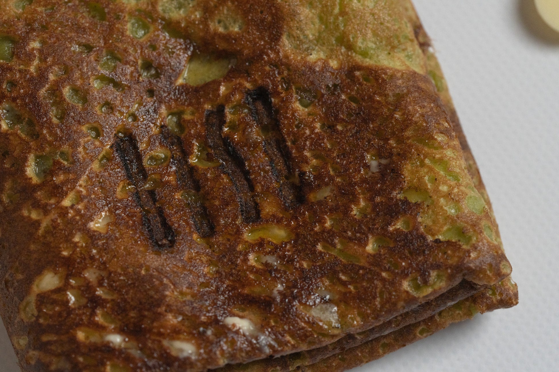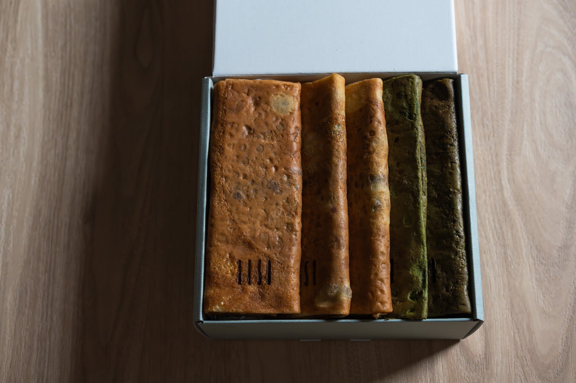 EQUALLYオリジナルのクレープ生地に京都宇治抹茶を練り込み、フランス産発酵バター、シチリア産のヘーゼルナッツ、ベルギー製ホワイトチョコレート、ヴァローナのフランボワーズショコラを挟み込み焼き上げました。
